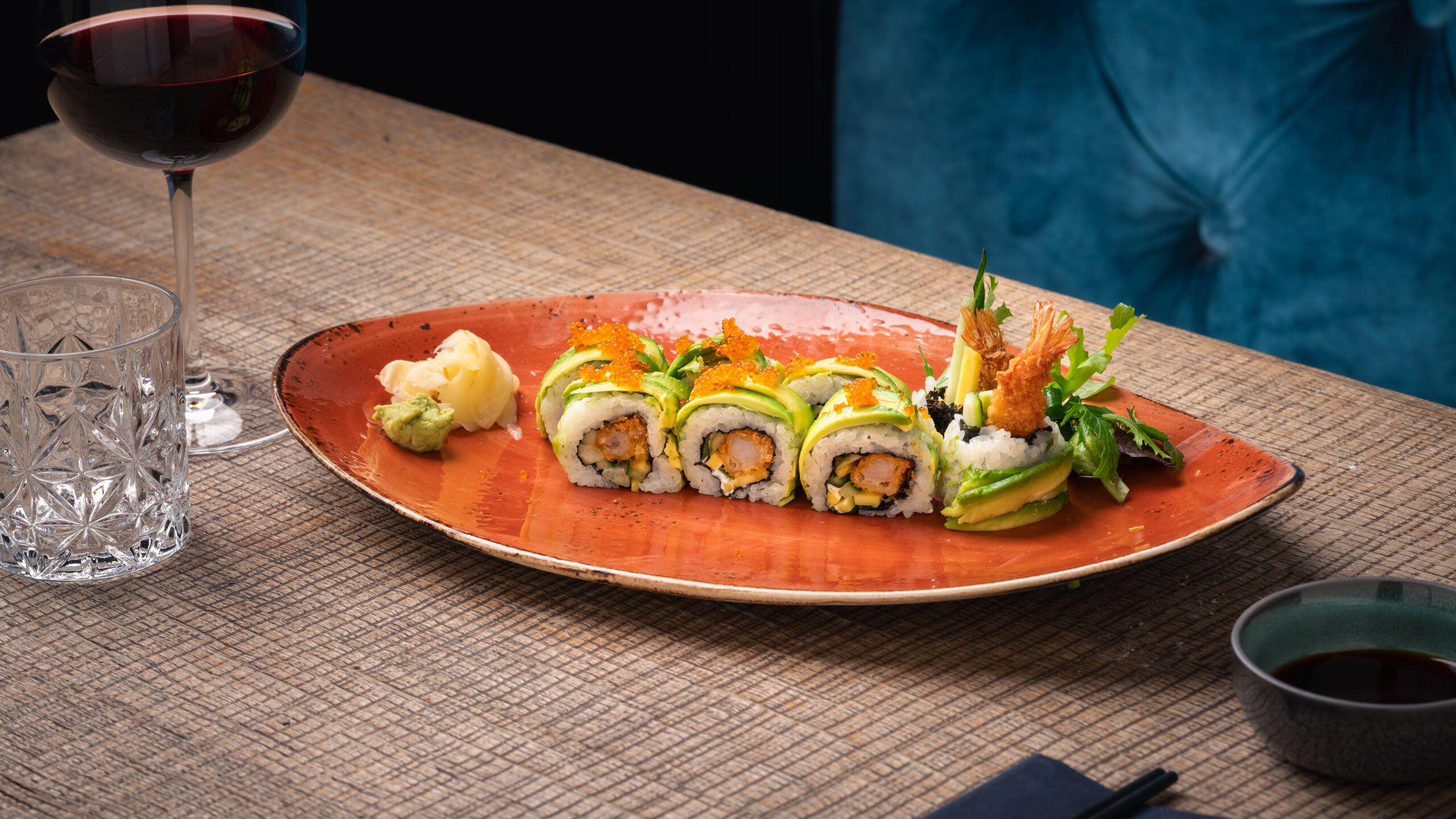 Frittierte Garnele, Gurke, Mango,Philadelphia, Tobiko, ummantelt mit Avocado