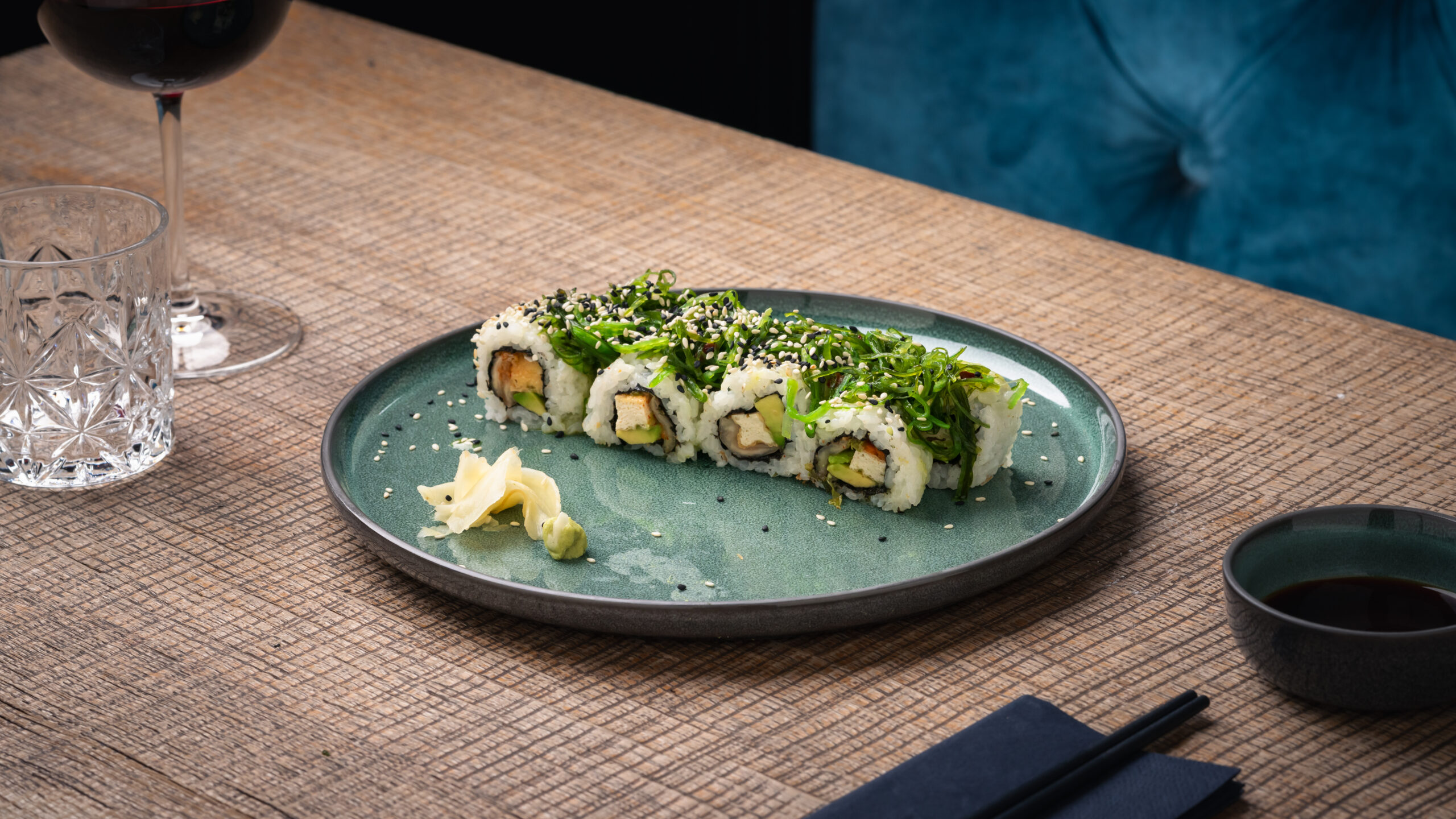 marinierter Tofu, Gurke, ummantelt mit Avocado